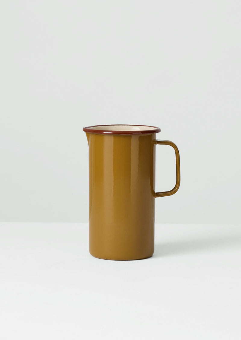 Traditional, durable and smooth, porcelain-infused enamel jug for the kitchen, for camping, or as you will. Accented by contrasting colour around the rim and another at the interior. With a small amount of colour variation from batch to batch. Mint/Chestnut and Ochre/Chestnut colourways exclusive to TOAST.
