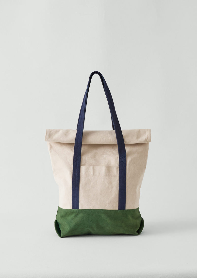 Roll-top bag constructed from panels of hardwearing cotton canvas. With two external slip pockets and suspended from shoulder straps.