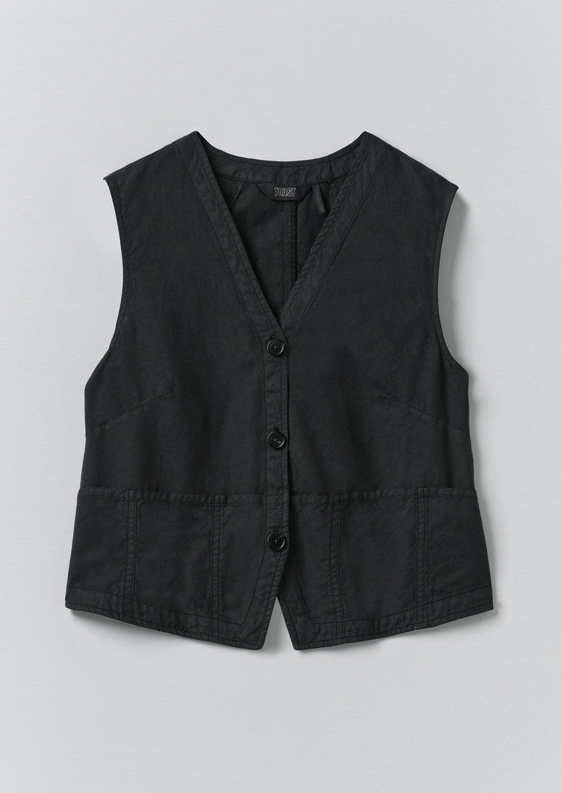 Our waistcoat top features side pockets which form part of the hem panel. Crafted from organic cotton and linen-blend canvas to a V-neck shape, then garment-dyed.