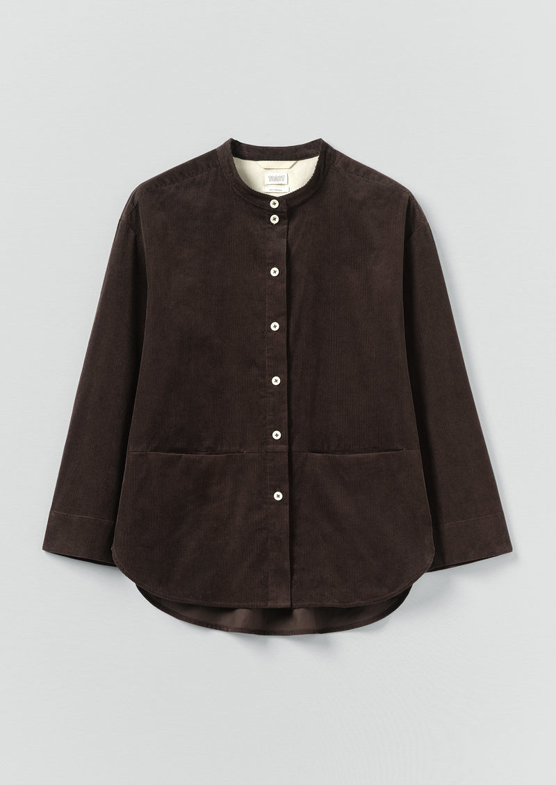 Organic cotton cord. Band collar. Internal hanging loop. Back box pleat. Dropped shoulders. Wristbone-length sleeves. Waist pockets. Curved hem. Corozo buttons.