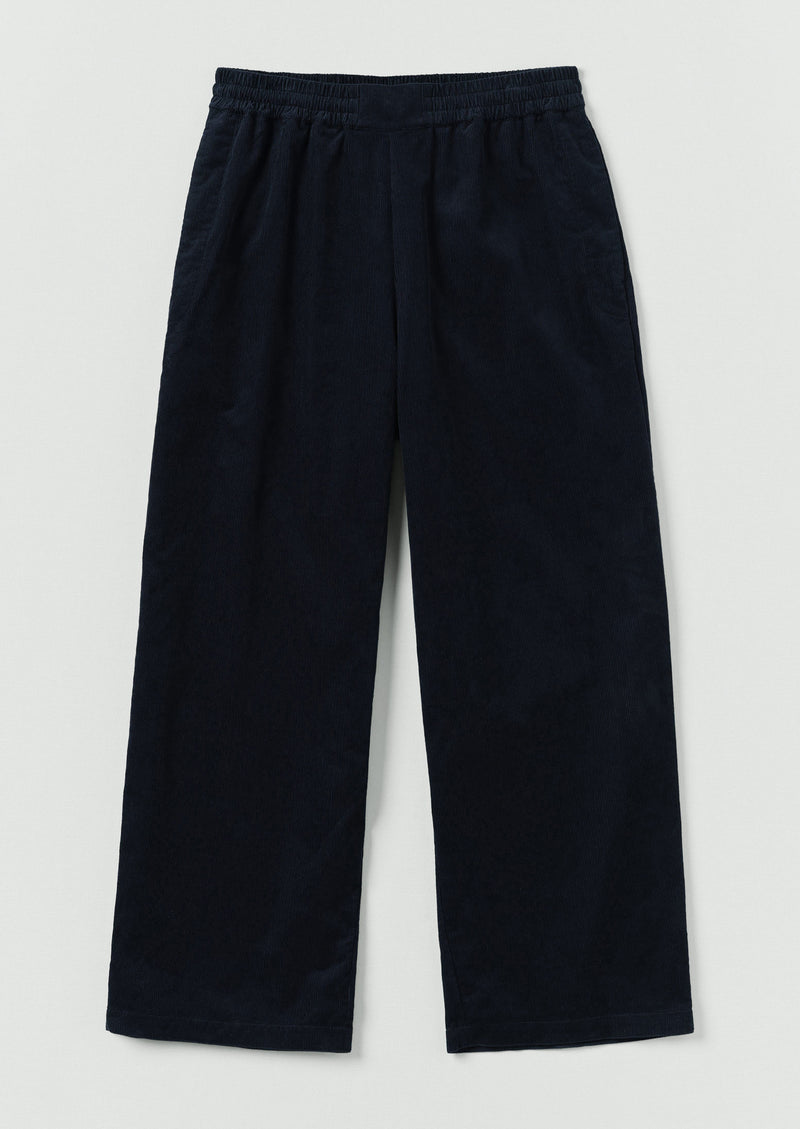 Organic cotton cord. Elasticated drawstring waist. Easy fit. Ankle length. Side pockets. Back patch pocket.