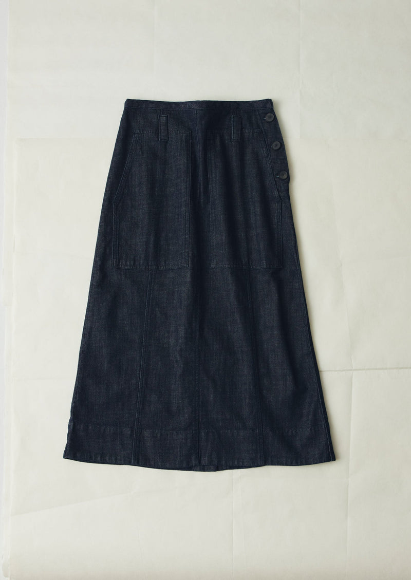 Our effortless skirt is cut to a soft A-line shape for a sense of ease, then punctuated by large side patch pockets. Crafted from organic cotton denim dyed with a technique that uses up to 70% less water than regular processes.