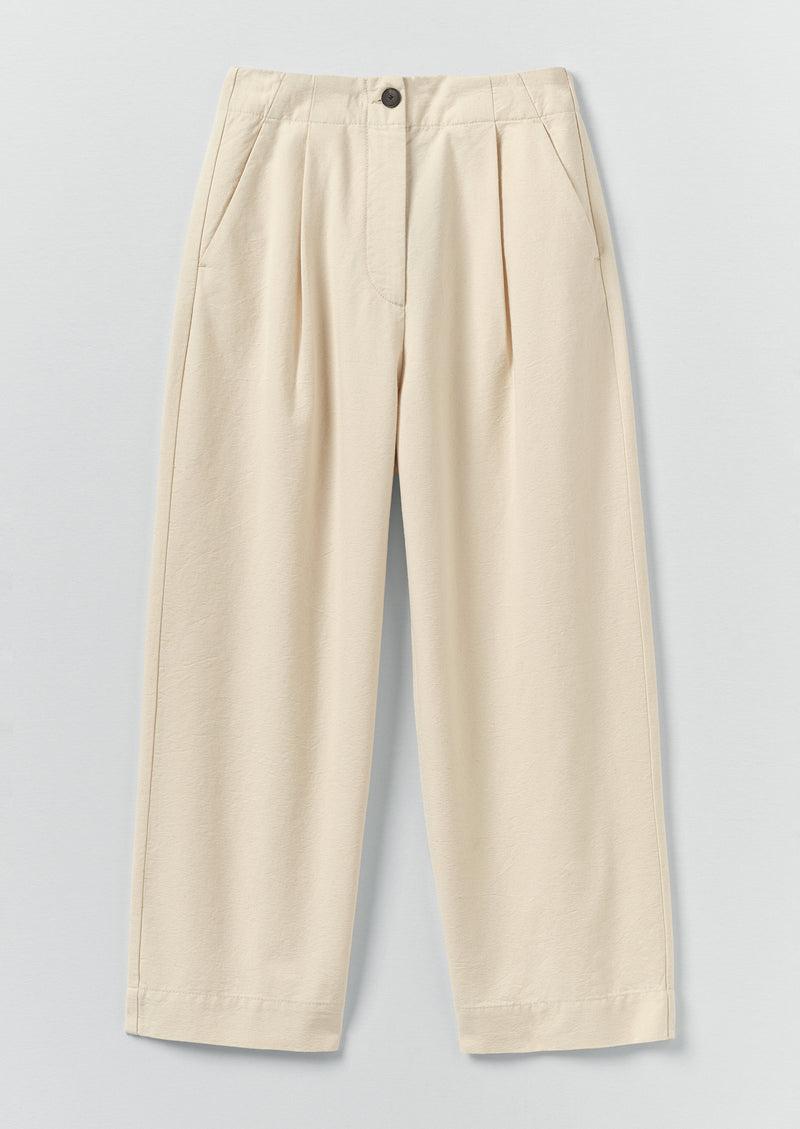 Front pleats give subtle volume to our trousers, which are made from organic cotton canvas. The relaxed rise creates an easy, laid-back silhouette with cropped legs. Finished with slant front pockets and back welt pockets.