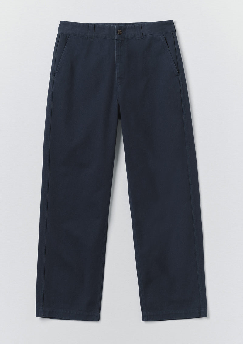 Weighty organic cotton drill. Garment dyed. Straight legs. Slanted side pockets. Back patch pockets. Front corozo button and zip.