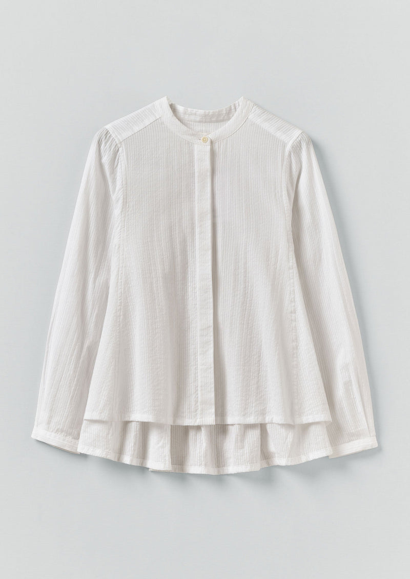 Shirt made from lightweight organic cotton seersucker. Pleats at the sleeves taper into narrow buttoned cuffs, balancing the stand collar. Soft gathers fall from the back yoke into a swingy silhouette.