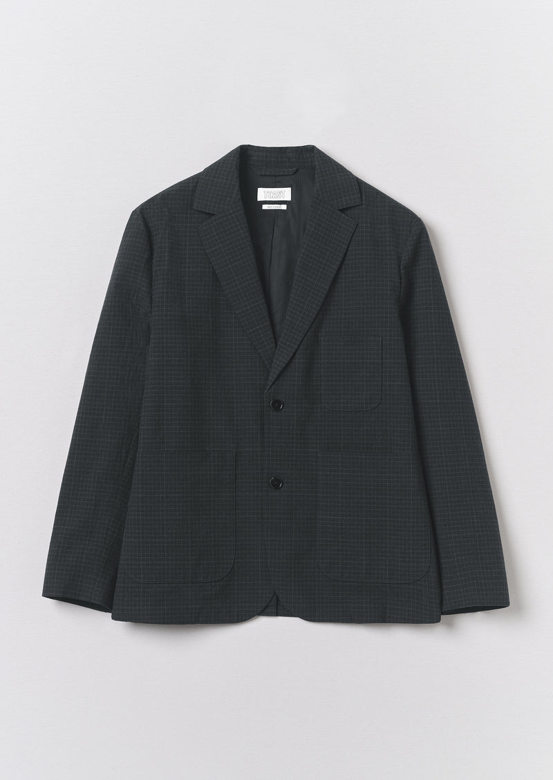 Checked organic cotton and wool blend. Revere. Relaxed silhouette. Internal hanging loop. Rounded front hem. Central back vent. Cotton lining. Patch pockets. Horn buttons.