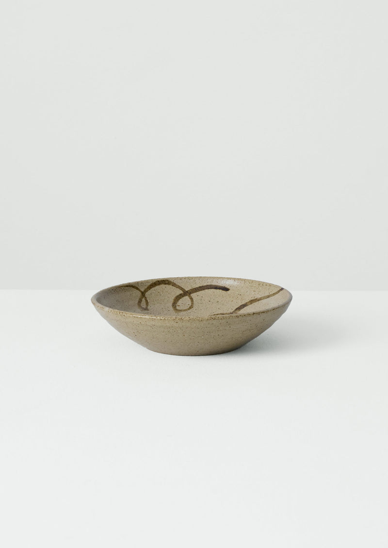Stoneware pasta plate patterned with a lyrical, swirling wave pattern by Skye Corewijn, a potter living and working in London, originally from Cape Town. Her work is thrown on the wheel in her East London studio with a focus on tactile finishes, organic forms and warm glazes. Being handmade, each piece is unique and there may be drips in the glaze.